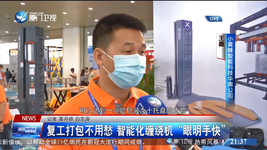 作為智能制造企業(yè),小黃蜂受到了本屆工博會(huì)的重視,展位面積達(dá)到了72㎡。與此同時(shí),廈門衛(wèi)視對(duì)展會(huì)現(xiàn)場(chǎng)的小黃蜂進(jìn)行了采訪,并將小黃蜂纏繞機(jī)作為智能制造的代表以新聞形式播出!