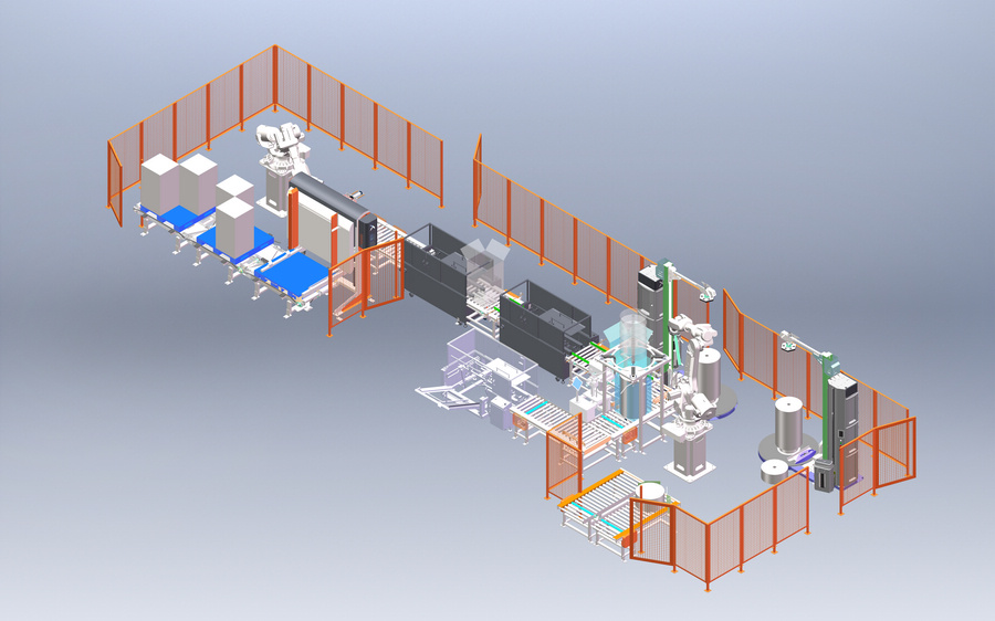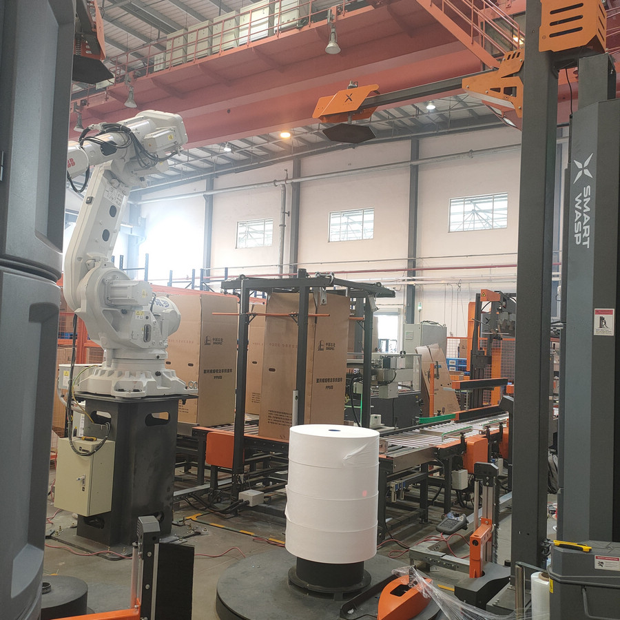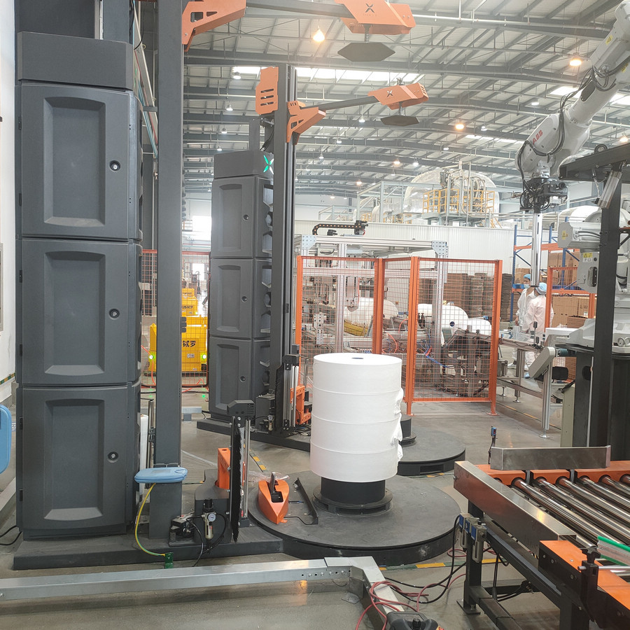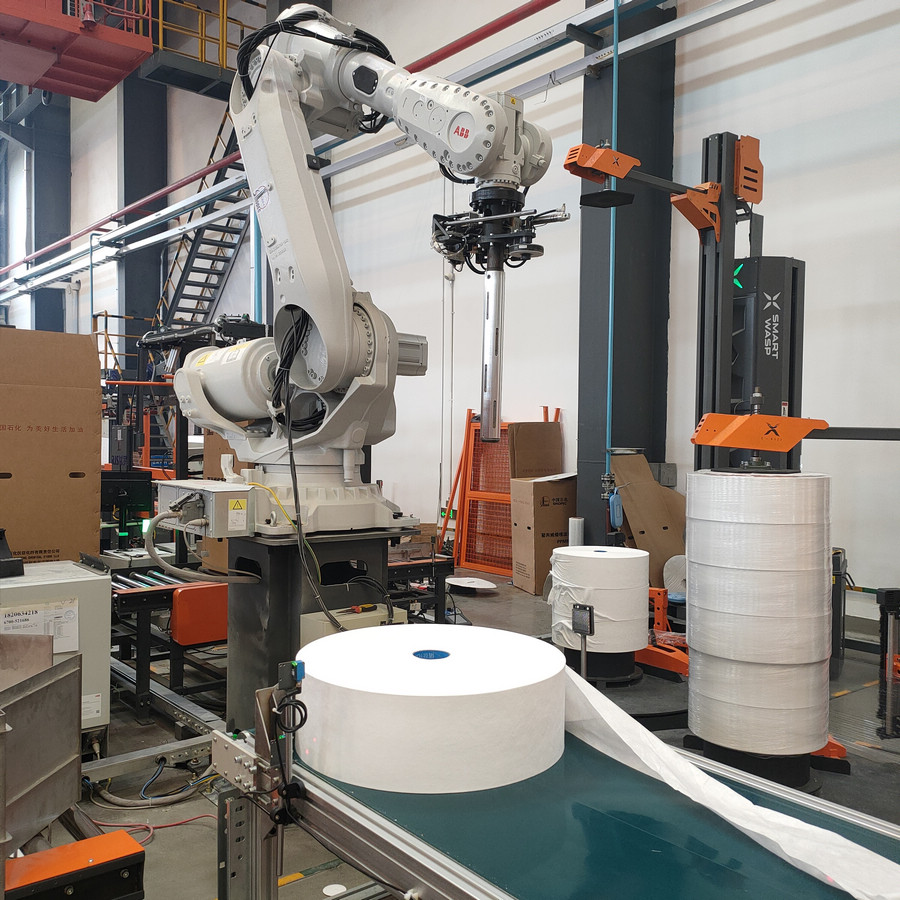 面對如此重要的產線,小黃蜂聯合鋱羅機器人,為中石化熔噴布產線精心研發(fā)定制,提供視覺定位,抓取機器人,纏繞機,開箱機,封箱機,稱重機,貼標機,供棧機,碼垛機器人。