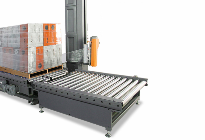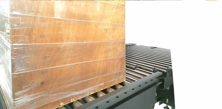 小黃蜂智能在線纏繞機采用89mm不銹鋼輸送滾筒,滾筒間距小,從而保證平穩(wěn)輸送托盤。