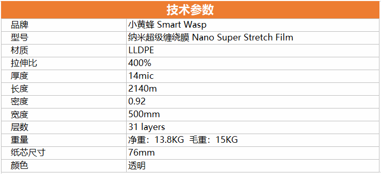 傳統(tǒng)纏繞膜,每個標準托盤使用量達250克,使用小黃蜂納米纏繞膜可節(jié)省40%。